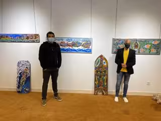 El artista Emilio Pascual (i) junto al concejal Juan Carlos Bueno (d) en la exposición 'Basuraleza'. - AYUNTAMIENTO DE SANTA MARTA DE TORMES
