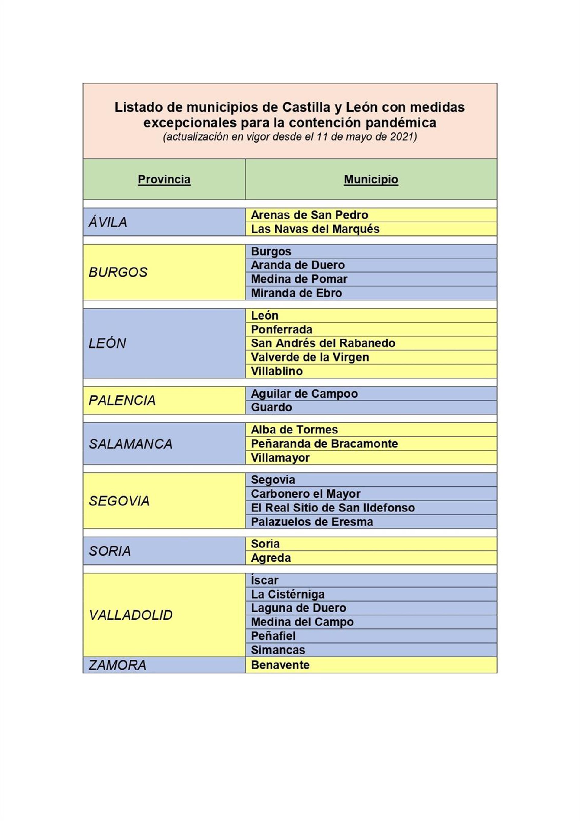 Según se acordó en la reunión del Consejo de Gobierno Extraordinario del lunes salen de la lista de restricciones otros ocho municipios, Alfoz de Quintañadueñas, Bembibre, Ciudad Rodrigo, Villares, Santa Marta, Cantalejo, Almazáz y Aldeamayor de San Martín.