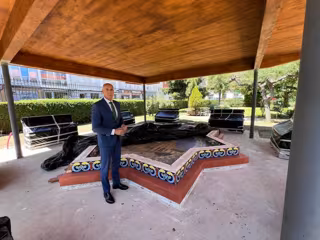 Está pendiente de integrar ahora el fuste y el capitel bajo la pérgola, que ya cobija a los bancos y la fuente estrellada. Todo ello permanece de momento oculto, a la espera de rematar los tratamientos de protección.