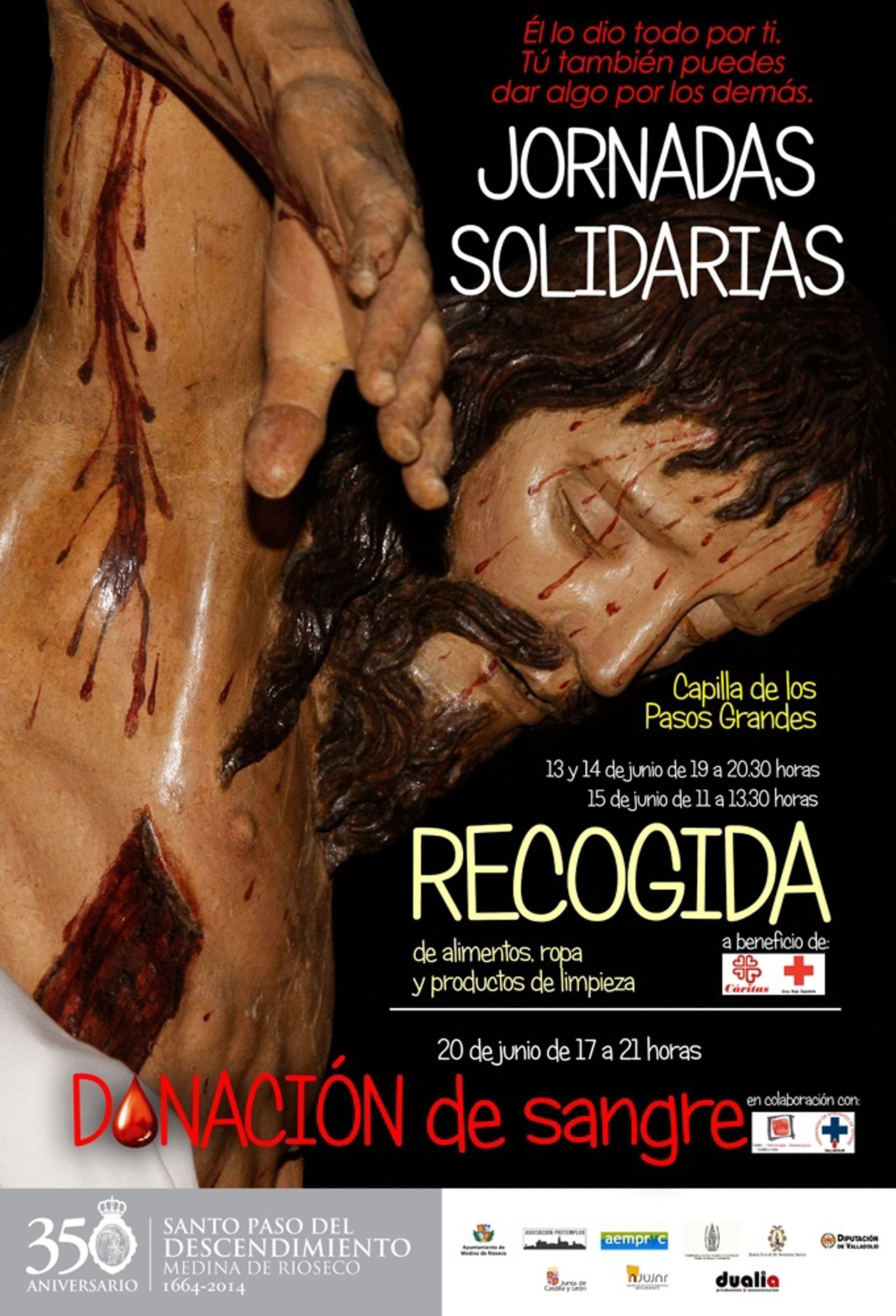 En la propia Capilla de los Pasos Grandes de Medina de Rioseco, los días 13, 14 y 15 de junio se llevará a cabo una campaña de recogida de alimentos no perecederos, ropa usada y productos de higiene. El fruto de esta campaña será entregado a Cáritas Parroquial y a la Asamblea Local de la Cruz Roja española.