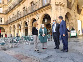 El ministro Escrivá, segundo por la derecha, en la Plaza Mayor de Salamanca, junto a autoridades locales. - EUROPA PRESS