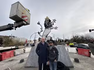El alcalde de León, José Antonio Diez (izquierda) y el escultor Fernando Ortiz supervisan la instalación de la escultura del 'León rampante' en la glorieta del Puente de Los Leones de la capital leonesa. - AYUNTAMIENTO DE LEÓN