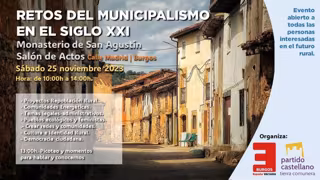 La coalición España Vaciada-Partido Castellano-Tierra Comunera (EV-PCAS-TC) celebra este sábado, 25 de noviembre, en Burgos una Jornada bajo el lema 'Retos del Municipalismo en el Siglo XXI' que tiene por objeto "dinamizar el activismo rural, fortalecer el tejido social de los pueblos" y "dotar de herramientas" a cargos públicos, candidatos y personas interesadas en el medio rural.