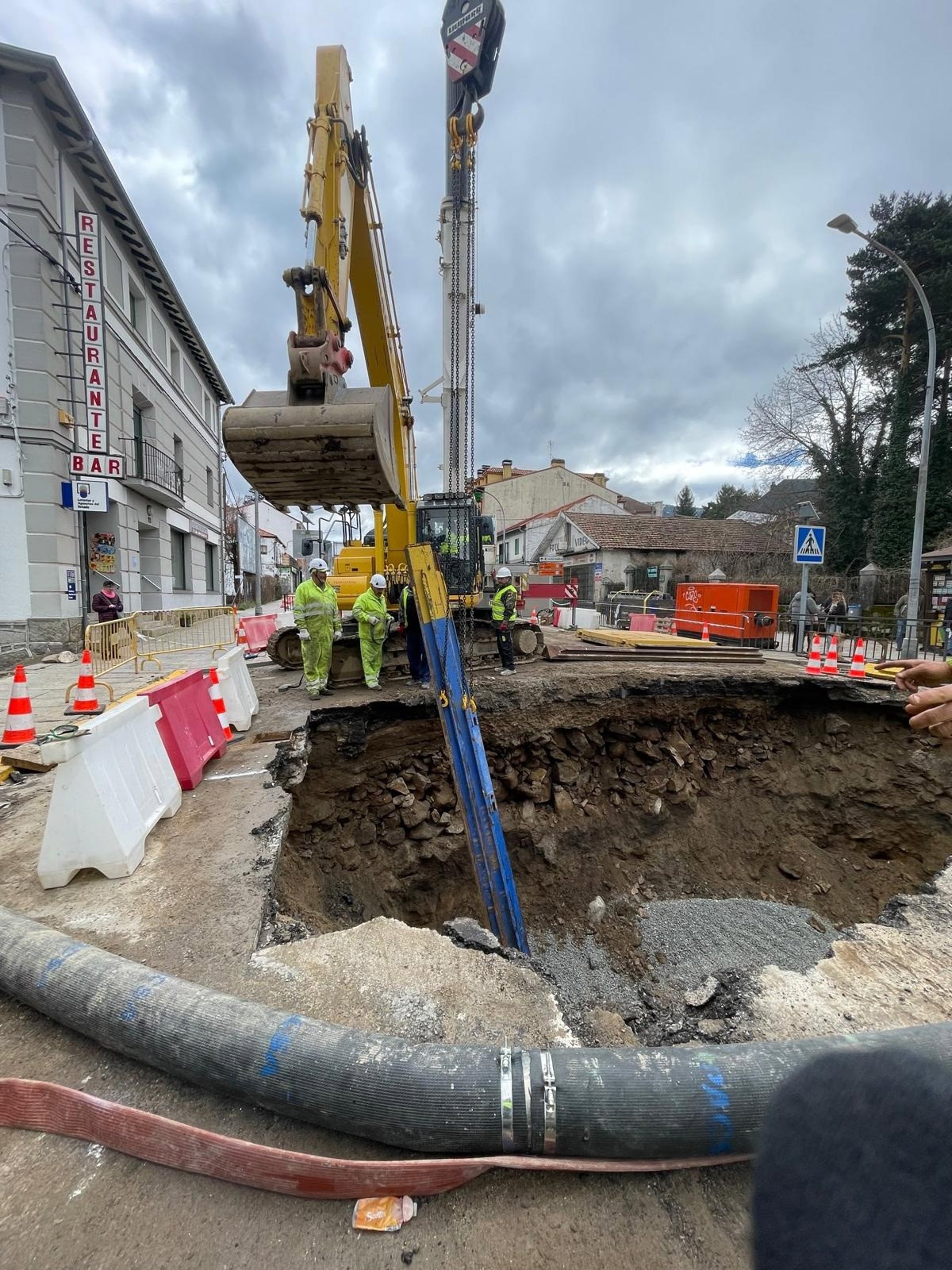 Por su parte, la Subdelegación del Gobierno en Segovia ha publicado un comunicado en el que anuncian que los operarios encargados de la reparación del socavón "provocado por la ruptura de un colector de titularidad municipal" han conseguido cerrar la vía de agua y achicarla, y que ya se empieza a excavar, reparar la base y limpiar de sedimentos la zanja. Hay que profundizar hasta los cuatro metros y apuntalar para no poner en peligro a los trabajadores.