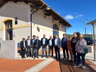 El presidente de la Diputación de León, Gerardo Álvarez Courel (quinto por la derecha), en la estación de FEVE de San Feliz de Torío, que acoge la exposición ‘La mirada cercana de la literatura’. Diputación de León. - DIPUTACIÓN DE LEÓN