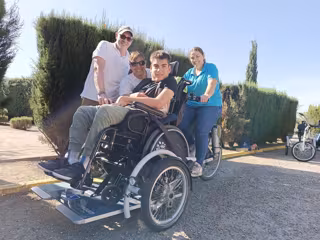 Uno de las participantes en el estudio, junto a su familia y una de sus fisioterapeutas - UEMC
