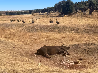 "Cuando me estaba acercando a la finca, ya vi sobrevolar muchísimos y es que se estaban comiendo al ternero y a la vaca que estaba pariendo. Es increíble el número de buitres que había", ha asegurado, además de calcular unas perdidas de "al menos 2.000 euros" por la muerte de los dos ejemplares.