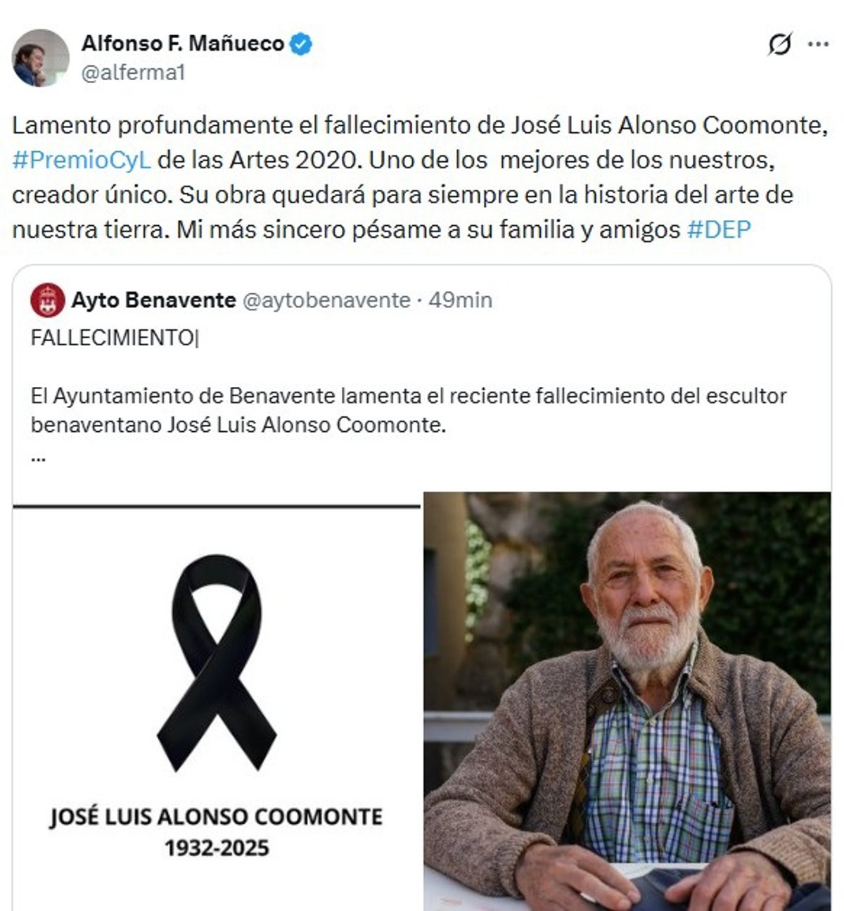 "Lamento profundamente el fallecimiento de José Luis Alonso Coomonte, #PremioCyL de las Artes 2020. Uno de los mejores de los nuestros, creador único", ha escrito el presidente de la Junta en su cuenta personal de 'X'.