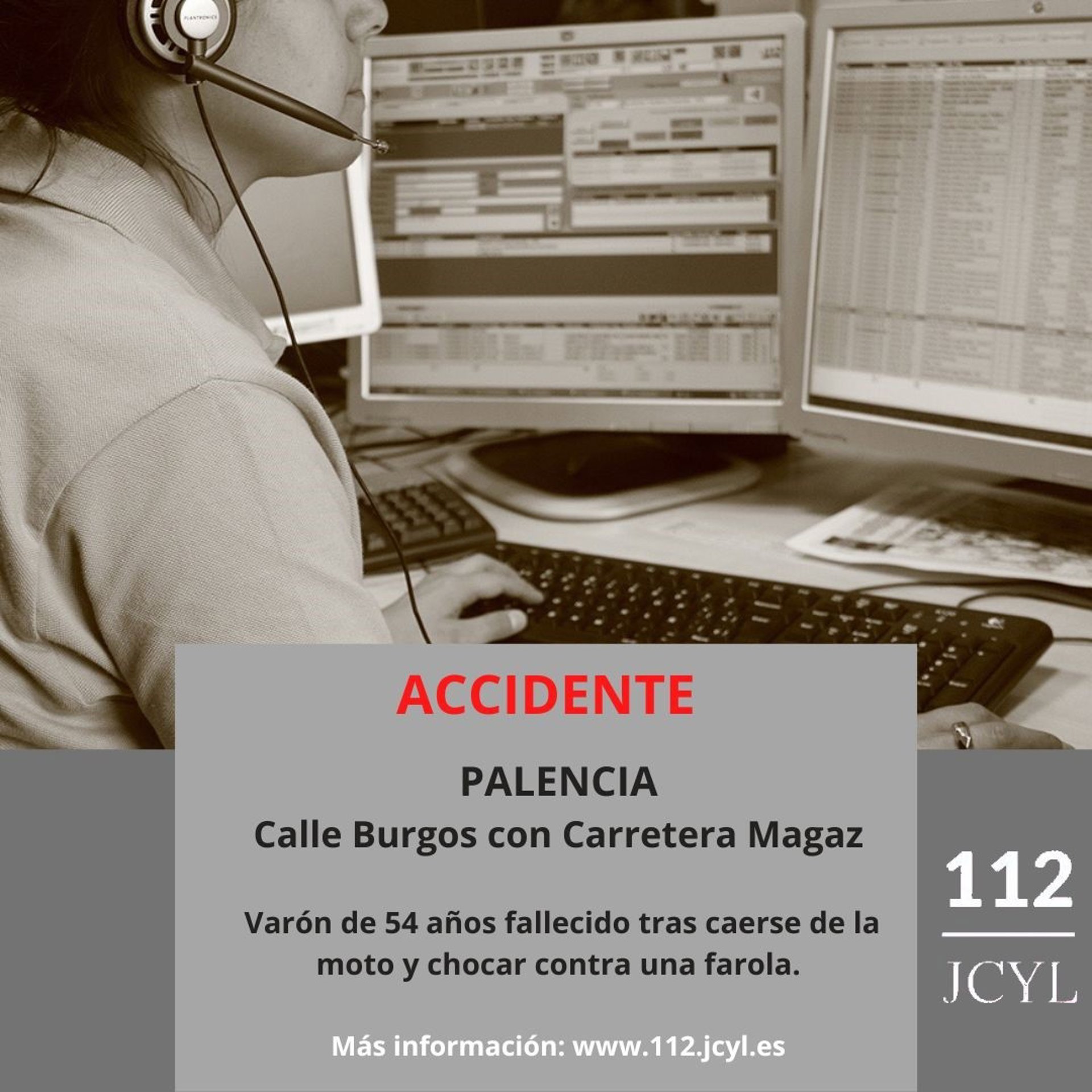 Un varón de 54 años ha perdido la vida esta noche tras caerse y chocar con su motocicleta contra una farola en Palencia capital, según los datos que aporta el Servicio de Emergencias de Castilla y León 112 recogidos por Europa Press.
