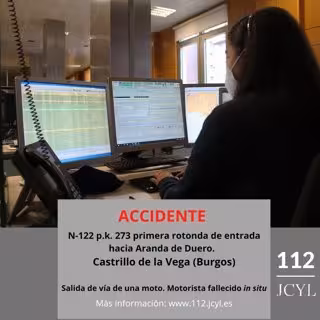 El accidente ha ocurrido en torno a las 22.54 horas del miércoles, día 20 de julio, cuando se informó al 112 del accidente de una motocicleta en la N-122 kilómetro 273, en la primera ronda de entrada hacia Aranda de Duero, en el municipio de Castrillo de la Vega, donde un motorista había quedado atrapado debajo de la moto y del quitamiedos.