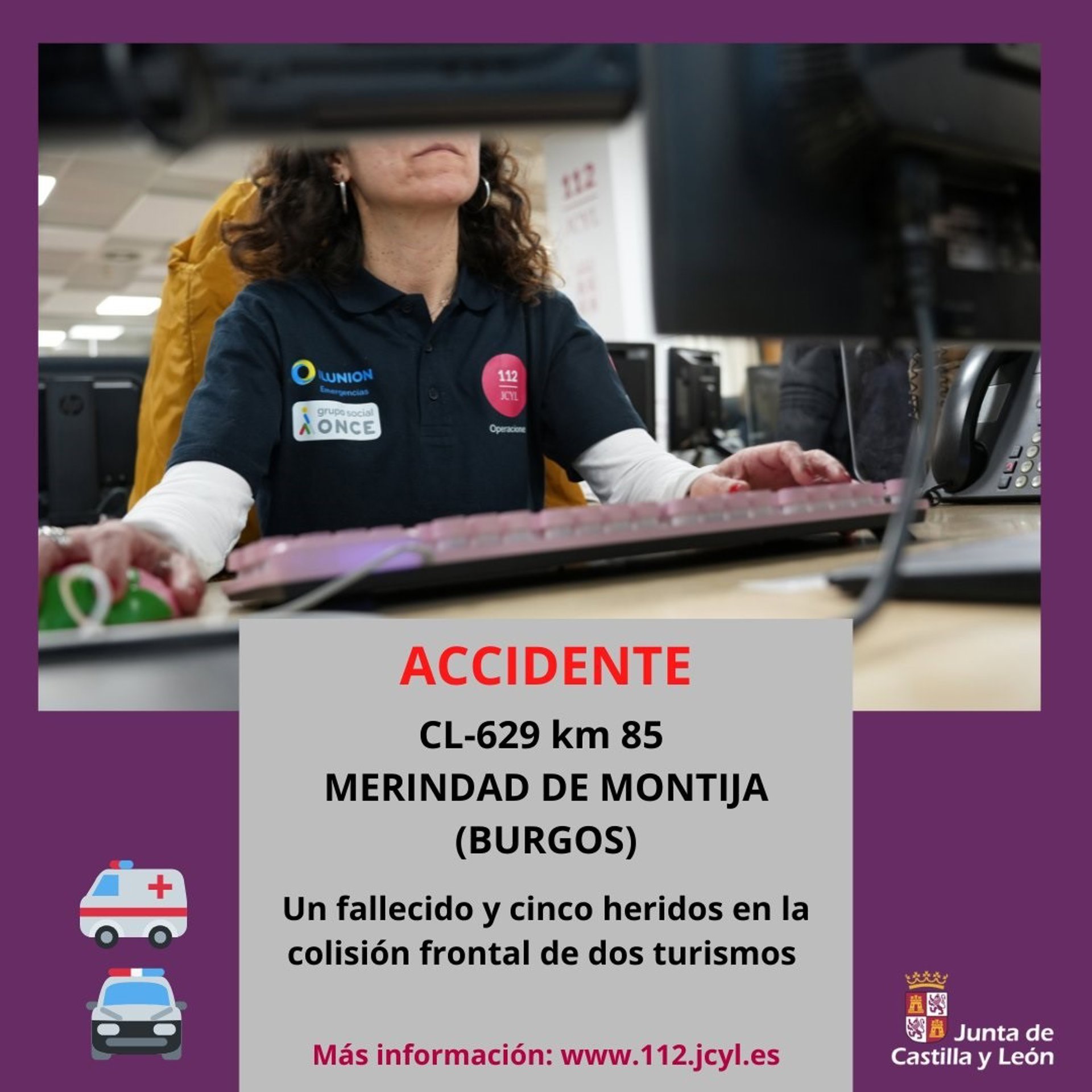 Un varón de 76 años ha fallecido y cinco personas han resultado heridas, entre ellas dos menores, en una colisión frontal entre dos turismos en el kilómetro 85 de la CL-629, en el término municipal de Merindad de Montija (Burgos), según datos del 112 Castilla y León recogidos por Europa Press.
