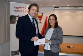 En el acto de entrega del cheque solidario han participado Carlos Treceño, presidente del Colegio Oficial de Farmacéuticos de Valladolid, y Noelia Peña, delegada de Entreculturas en Valladolid.