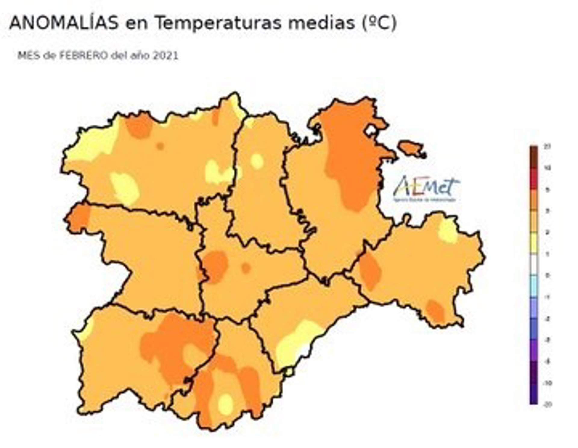 La comunidad autónoma de Castilla y León registró un mes de febrero "muy húmedo" y "muy cálido" en todo el territorio con una anomalía positiva de 2,5 grados y con especial incidencia en el caso de las temperaturas nocturnas que superaron en 3,5 grados, según consta en el Avance Meteorológico elaborado por la Aemet y recogido por Europa Press.