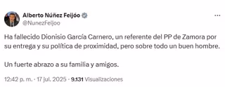 El presidente del PP ha escrito en su cuenta personal: "Ha fallecido Dionisio García Carnero, un referente del PP de Zamora por su entrega y su política de proximidad, pero sobre todo un buen hombre", al tiempo que ha mandado un "fuerte abrazo" a su familia y amigos.
