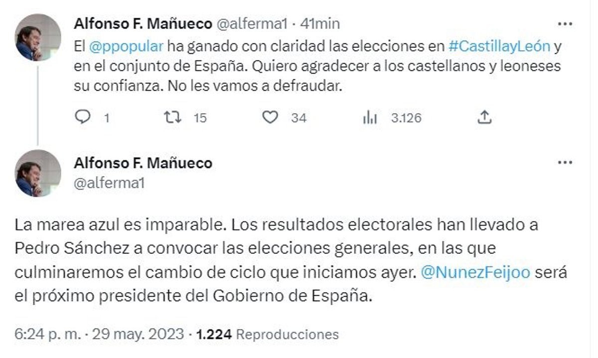 El presidente del Partido Popular de Castilla y León y de la Junta, Alfonso Fernández Mañueco, ha asegurado este lunes en varios mensajes en su cuenta de Twitter que en las elecciones generales que ha convocado el presidente del Gobierno, Pedro Sánchez, el PP culminará "el cambio de ciclo" que considera que se ha iniciado este domingo con los resultados de las municipales.