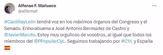 El presidente del Partido Popular de Castilla y León, Alfonso Fernández Mañueco, ha mostrado su satisfacción este miércoles a través de un mensaje en la red social conocida como Twitter después de que el presidente nacional de la formación, Alberto Núñez Feijóo, haya propuesto al diputado por Salamanca José Antonio Bermúdez de Castro y al senador por Segovia Javier Maroto para formar parte de los "máximos órganos" de las cámaras.