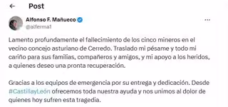 Mensaje de pésame por cinco mineros fallecidos del presidente de la Junta de Castilla y León, Alfonso Fernández Mañueco, en 'X'. - 'X'