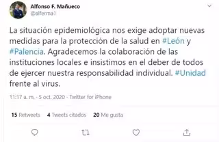 Así lo ha señalado el dirigente autonómico en su cuenta de Twitter este lunes, en la que ha apuntado que la situación epidemiológica "exige adoptar nuevas medidas para la protección de la salud en León y Palencia".