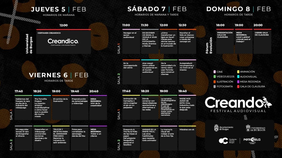 El Festival Creando se celebrará del 5 al 8 de febrero, con actividades previas vinculadas al ámbito universitario y un programa central que tendrá lugar del 6 al 8 de febrero en el Fórum Evolución Burgos, centrado en la formación especializada, la exhibición de proyectos, el networking profesional y la reflexión sobre industria, emprendimiento y empleabilidad en el ámbito audiovisual y digital.