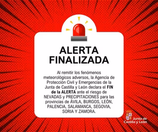 La Agencia de Protección Civil y Emergencias de la Junta de Castilla y León ha declarado este martes, 23 de diciembre, el fin de la alerta ante el riesgo de nevadas y precipitaciones en las provincias de Ávila, Burgos, León, Palencia, Salamanca, Segovia, Soria y Zamora.