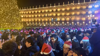 Miles de personas han celebrado, un año más, una Nochevieja especial en la Plaza Mayor de Salamanca, fiesta ahora denominada 'Fin de Año Universitario' y que nació de manera espontánea en 1999, por lo que ha cumplido ya 26 años.