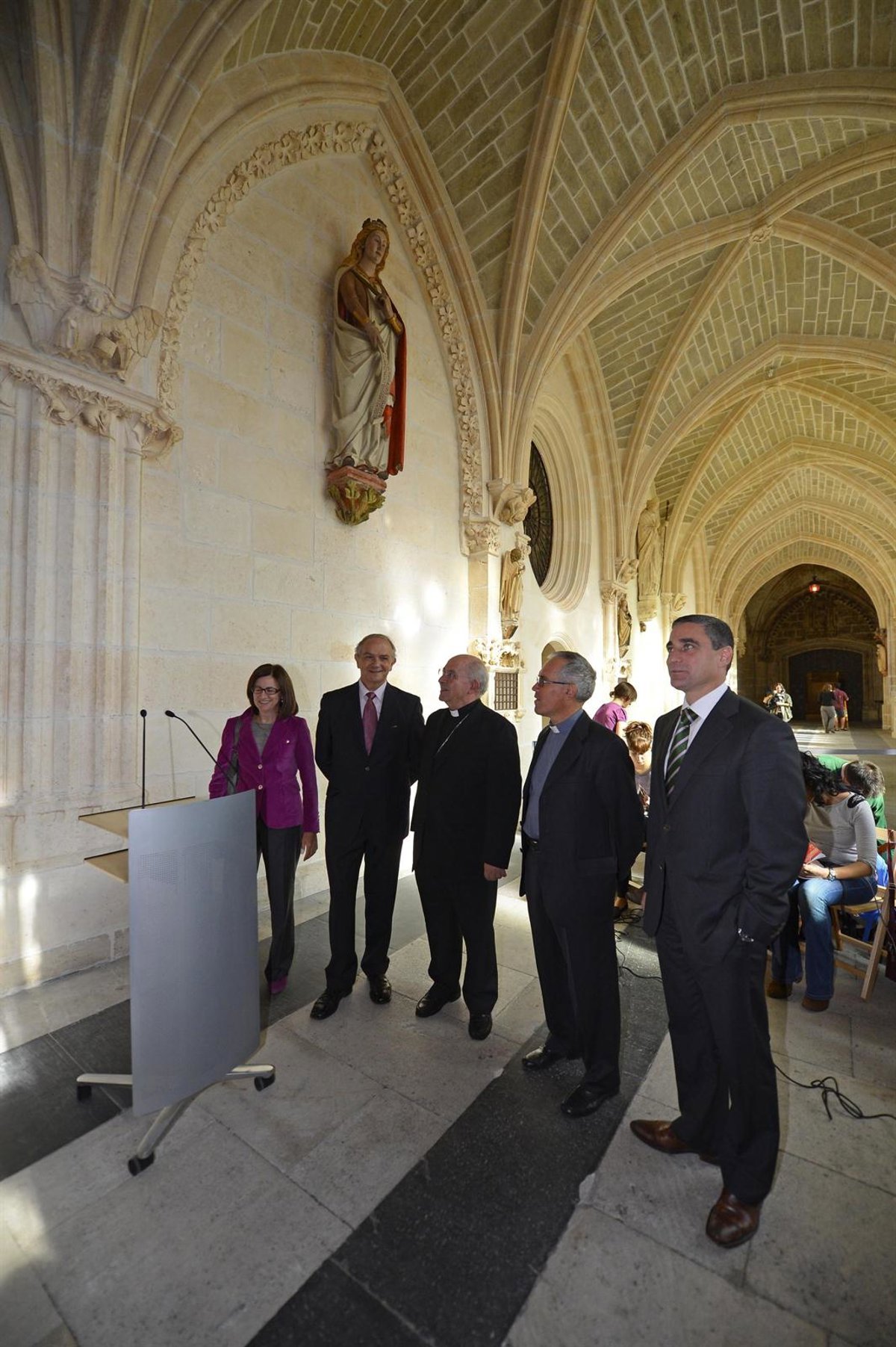 El arzobispo de Burgos, Francisco Gil Hellín, acompañado del presidente de Caja de Burgos, José María Leal, ha presentado este martes el resultado de las obras de restauración de la panda norte del Claustro Alto de la Catedral de Santa María, de la capital burgalesa.