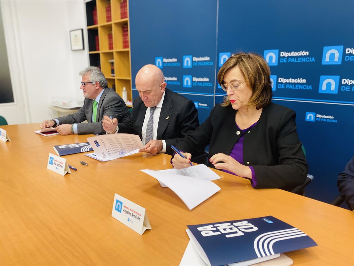 El consejero de la Presidencia, Jesús Julio Carnero, y la presidenta de la Diputación de Palencia, Ángeles Armisén, han firmado este lunes el convenio que regula la gestión y aplicación del nuevo Fondo de Cohesión Territorial y que en la provincia palentina beneficiará a 190 municipios y que permitirá movilizar casi tres millones de euros.