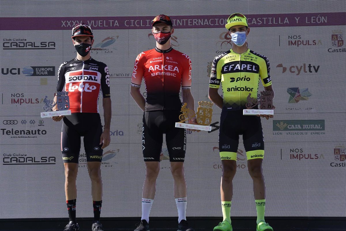 El francés Matis Louvel (en el centro), ganador de la Vuelta a Castilla y León, por delante de Oldani (a su derecha) y Moreira (a su izquierda). - VUELTA CICLISTA A CASTILLA Y LEÓN