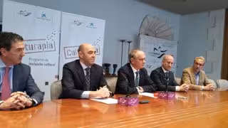 El presidente de la Fundación Caja de Burgos, José María Leal, y el director de la territorial Banca Privada y banca Premier de CaixaBank, Jorge Gutiérrez, han presentado este viernes en la Casa del Cordón el programa 'Culturapia', a través del que se acercará el ámbito cultural al centro penitenciario de la ciudad, el Hospital Universitario y el Hospital Psiquiátrico Fuente Bermeja.