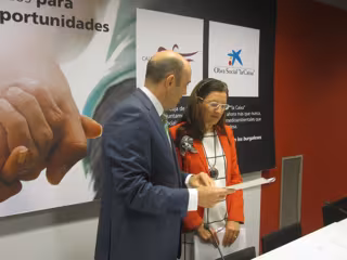 El director de banca privada de CaixaBank en Castilla y León, Jorge Gutiérrez, y la directora de la Obra Social de la Fundación Caja de Burgos, Rosa Pérez, han presentado este jueves la convocatoria del programa conjunto de Ayudas a Proyectos de Iniciativas Sociales, que cuenta con una dotación económica de 600.000 euros para entidades burgalesas.