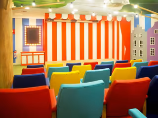 Cuando los pequeños visiten el cine encontrarán un sitio que nada tiene que ver con su día a día en el hospital. Está todo decorado como un mini mundo imaginario con animales tocando instrumentos y edificios de colores que simulan una ciudad de tamaño reducido para jugar y soñar.