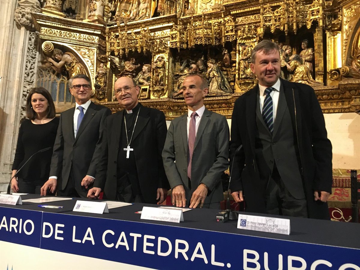 En la firma también han participado la jefa del Área de Desarrollo de las Personas y la Cultura de la Fundación Ibercaja, Inés González; el presidente del Cabildo Metropolitano, Pablo González; el alcalde de Burgos, Javier Lacalle; y el vicepresidente de la Fundación de la Catedral, Antonio Miguel Méndez Pozo.