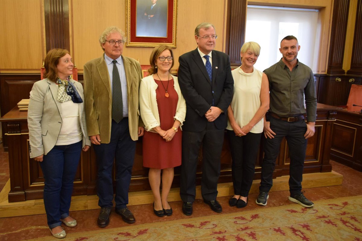 Los premiados, el investigador Isidre Ferrer: el centro Alzheimer's Research UK, representada por su directora Carol Routledge, y Simon Mcdermott por su vídeo viral en el que canta con su padre enfermo de Alzheimer, así como el investigador del CSIC, Javier de Felipe, que recibirá un cheque de 22.000 euros para el desarrollo del programa 'Cajal Blue Brain', han sido recibidos este miércoles por el alcalde de León, Antonio Silván, y la directora de la fundación, Regina Granja.