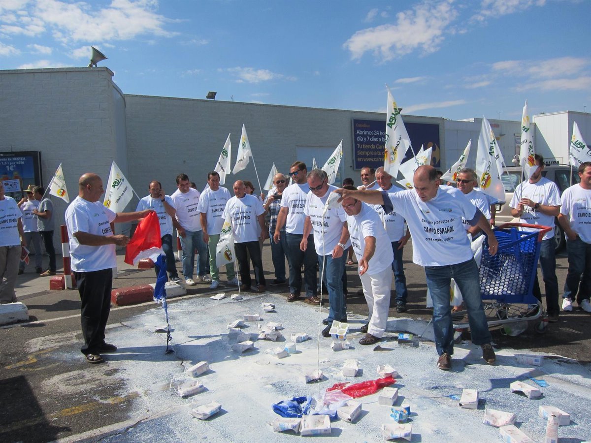 La Alianza por la Unidad del Campo, formada por UPA y COAG en Castilla y León, y la Unión de Cooperativas Agrarias (Urcacyl) han mostrado este viernes su rechazo a los productos lácteos franceses con la quema de dos banderas de la nación gala y el vertido de leche y yogures durante un acto de protesta frente al Carrefour del Estadio José Zorrilla en Valladolid.