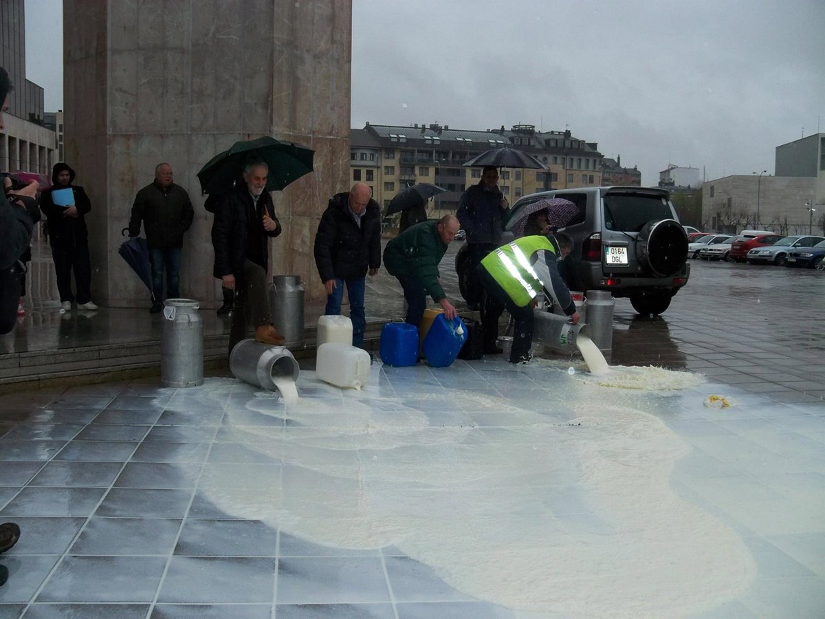 Los ganaderos de la montaña leonesa, acompañados de representantes de las organizaciones agrarias asentadas en la provincia, Asaja, Ugal, Uccl y Coag, han vuelto a protestar derramando leche frente a la Delegación Territorial de la Junta en León para exigir una solución a las explotaciones de la montaña a las que no se les recoge la producción desde el pasado 1 de abril.