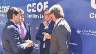 De frente, Garamendi junto al presidente de la CEOE Castilla y León, Santiago Aparicio (a su dcha), el secretario regional del PSOE en Castilla y León, Carlos Martínez (a su izda) y el presidente de la Junta de Castilla y León, Alfonso Fernández Mañueco - EUROPA PRESS