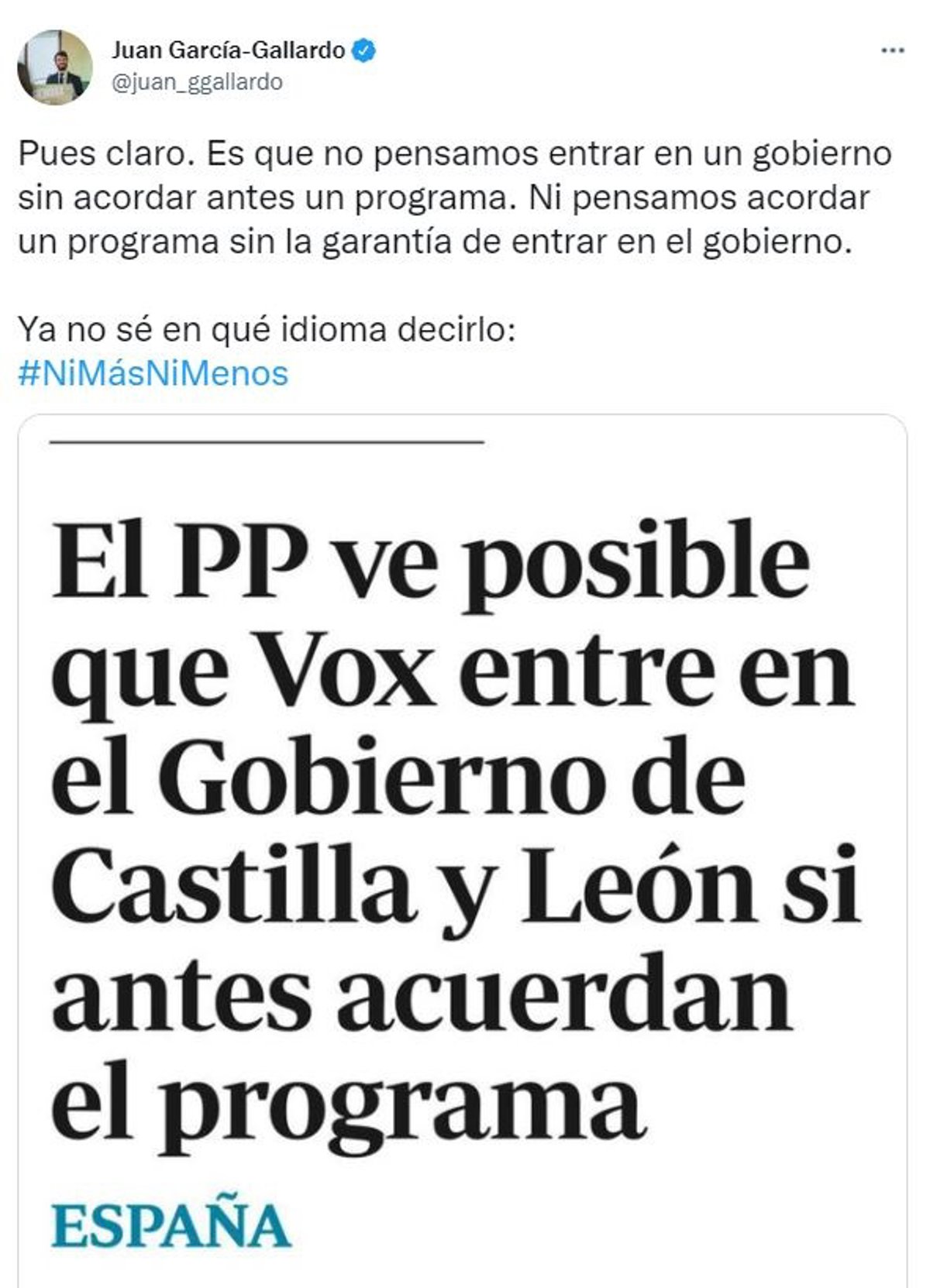 En su mensaje de Twitter, el procurador electo de VOX ha escrito: "Pues claro. Es que no pensamos entrar en un gobierno sin acordar antes un programa. Ni pensamos acordar un programa sin la garantía de entrar en el Gobierno. Ya no sé en que idioma decirlo".