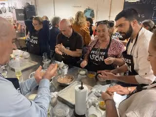 En cada una de ellas los asistentes han sido recibidos con un espumoso de León y han tenido la oportunidad de cocinar con los chefs croquetas de morcilla de León con compota de pera conferencia de El Bierzo, una de las cuatro tapas que han podido degustar durante la jornada.