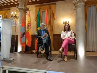 La consejera de Movilidad y Transformación Digital, María González Corral (d), antes de su participación en la clausura de la presentación en el Palacio de Figueroa de Salamanca - EUROPA PRESS