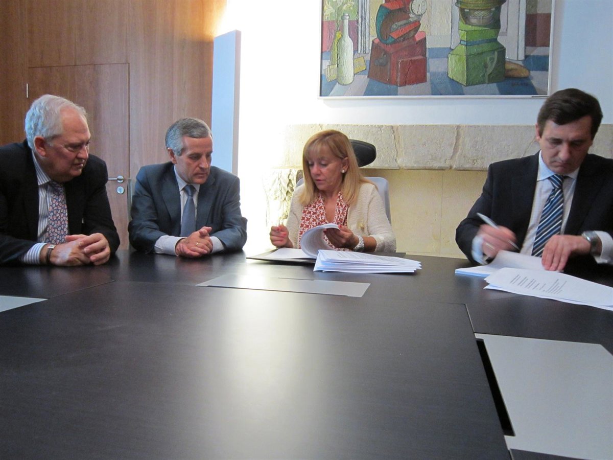 La presidenta del Consorcio del Aeropuerto de León, Isabel Carrasco, acompañada del vicepresidente, Emilio Gutiérrez, y el delegado de la Junta de Castilla y León, Guillermo García, ha suscrito este jueves con Felipe de Burgos, director gerente de la compañía aérea Good Fly, el contrato por el que se adjudica el concurso para el servicio de fomento y promoción del aeropuerto de León en su fase de lanzamiento.