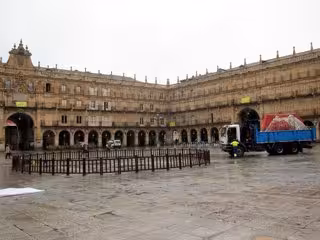 La Plaza Mayor de Salamanca ya alberga en su centro la 'Gran Bola', que dará colorido a la iluminación navideña y que no se había colocado hasta el momento para esperar a que pasase la celebración de la Nochevieja Universitaria.