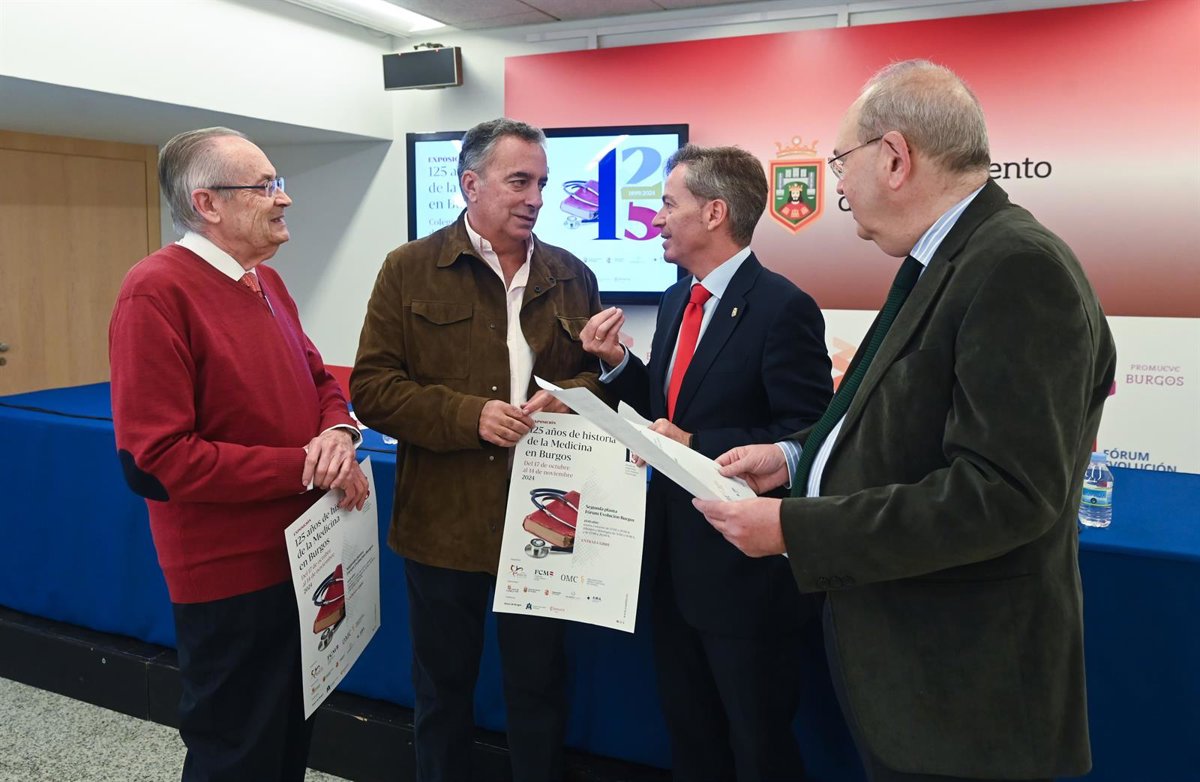 El presidente del Colegio de Médicos de Burgos, Joaquín Fernández de Valderrama; el concejal y presidente de la Sociedad Promueve, César Barriada, además de los comisarios de la muestra los doctores José Manuel López Gómez y Martín de Frutos, han presentado el contenido de una exposición "impactante" que recorre la historia de la ciudad y de su provincia en "un viaje fascinante" que ilusionará a facultativos y a pacientes.