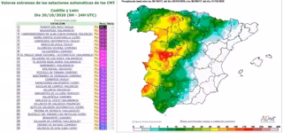 Respecto a las rachas de viento en la jornada del martes día 20 de octubre, destacan El Maillo (Salamanca) y La Riba de Escalote (Soria) con 136,4 y 115,2 kilómetros por hora en cada caso. La Aemet informa asimismo de un récord de racha máxima registrada en un mes de octubre en la ciudad de Segovia con 96,1 kilómetros por hora.