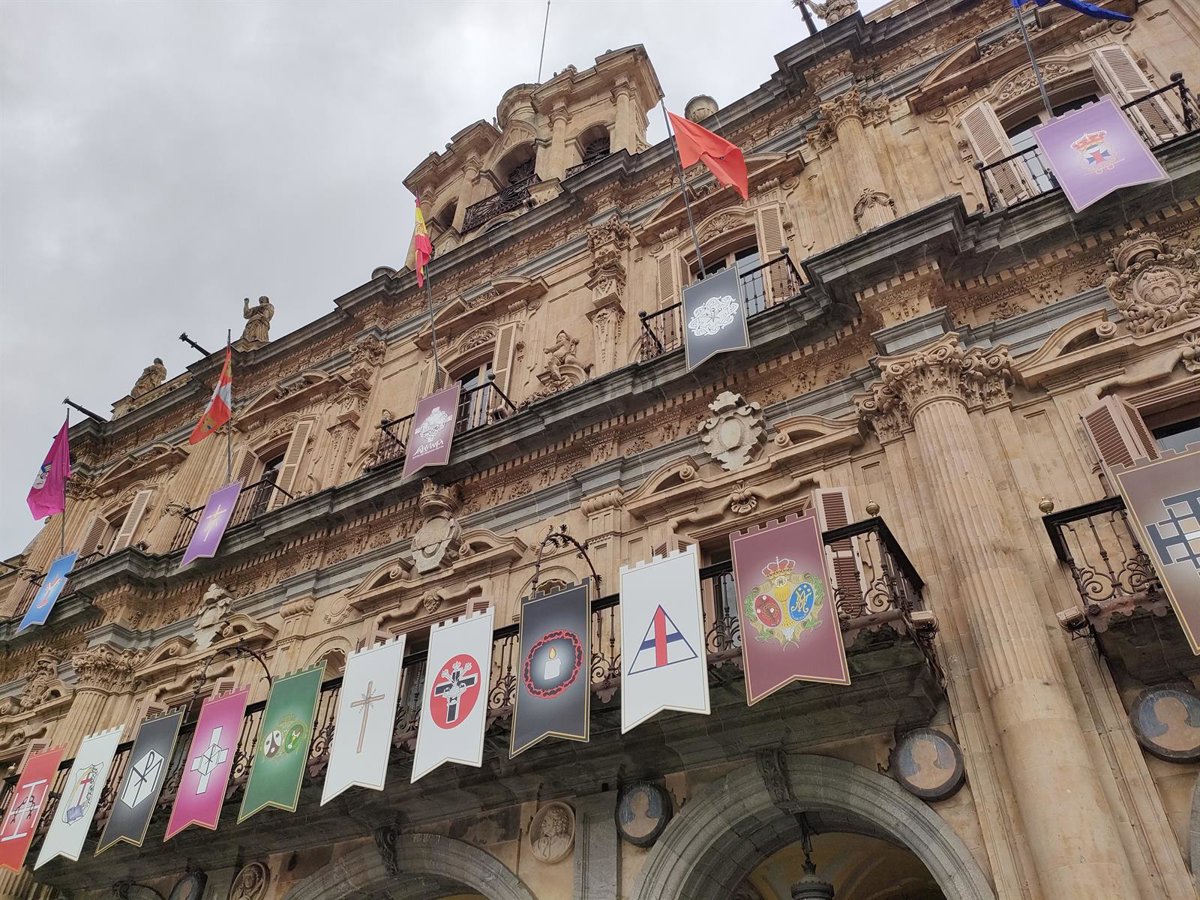 Fachada del Ayuntamiento de Salamanca, que luce estos días los reposteros de Semana Santa - EUROPA PRESS