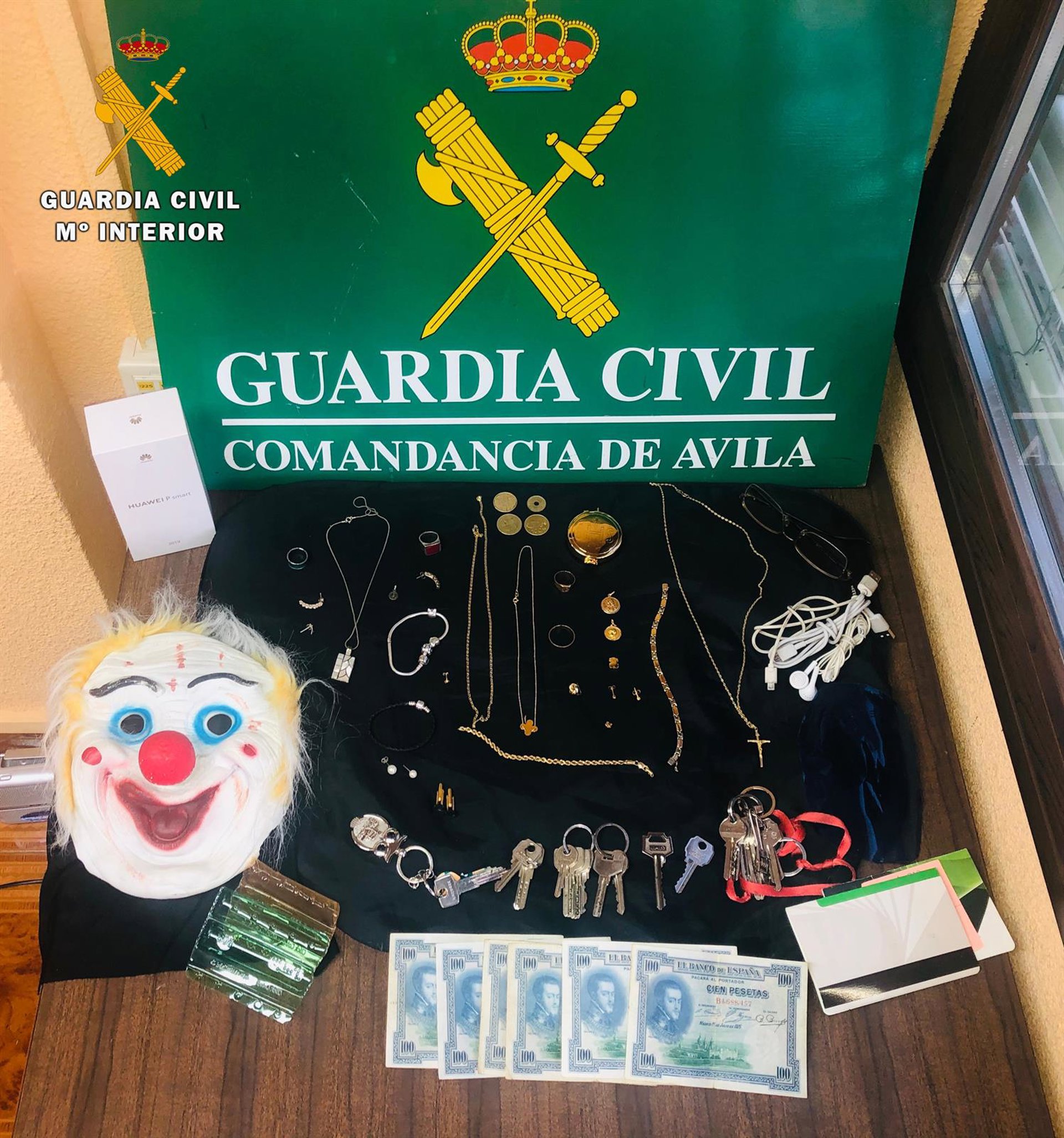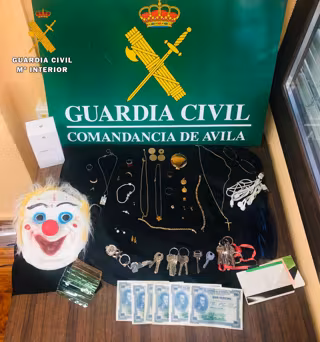 En el interior del vehículo, donde viajaban dos varones, se encontraron numerosos efectos procedentes de los robos, como joyas de oro, objetos de culto religioso y una máscara utilizada como medio de ocultación.