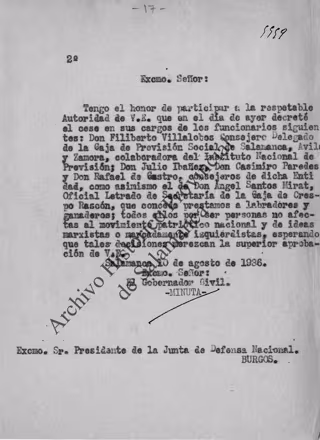 En el mismo legajo ha aparecido y se ha logrado rehacer el expediente de depuración instruido en agosto de 1936 en el que se disponía la destitución de Filiberto Vilalobos como consejero delegado de la Caja de Previsión Social, y también los de Julio Ibáñez, Casimiro Paredes y Rafael de Castro, que eran también consejeros de la misma entidad, y el de Ángel Santos Mirat como letrado de la Secretaría de la Caja de Crespo Rascón.