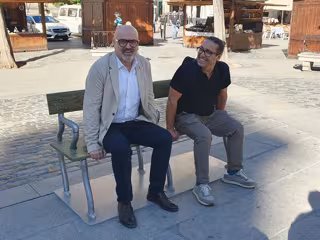 El concejal de Cultura, Juan carlos Monroy (izda), sentado en el 'banco danzarín' . - EUROPA PRESS