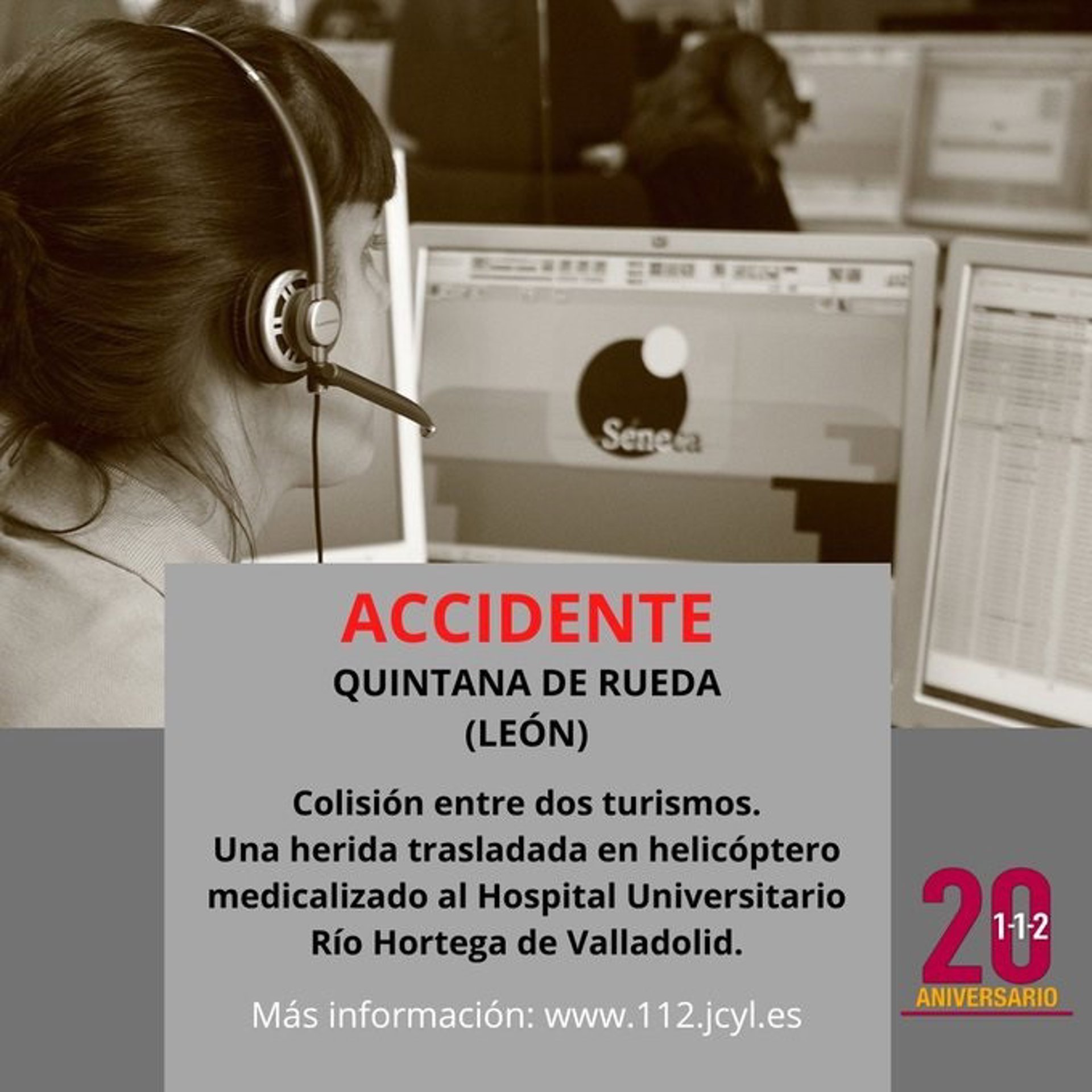 Una mujer ha tenido que ser trasladada en helicóptero al Hospital Universitario Río Hortega de Valladolid tras herida este lunes en un accidente de circulación consistente en una colisión entre dos turismos en la travesía de Quintana de Rueda, en León.