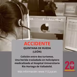 Según los primeros datos aportados por el Servicio de Emergencias de Castilla y León 112, este accidente ha ocurrido alrededor de las 11.28 horas de este lunes, 31 de octubre, cuando se informó de la colisión entre dos turismos en la travesía de Quintana de Rueda en la que una mujer había resultado herida y se encontraba atrapada en el interior del vehículo.