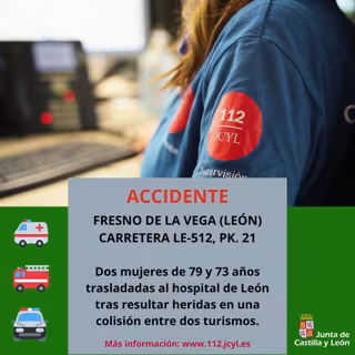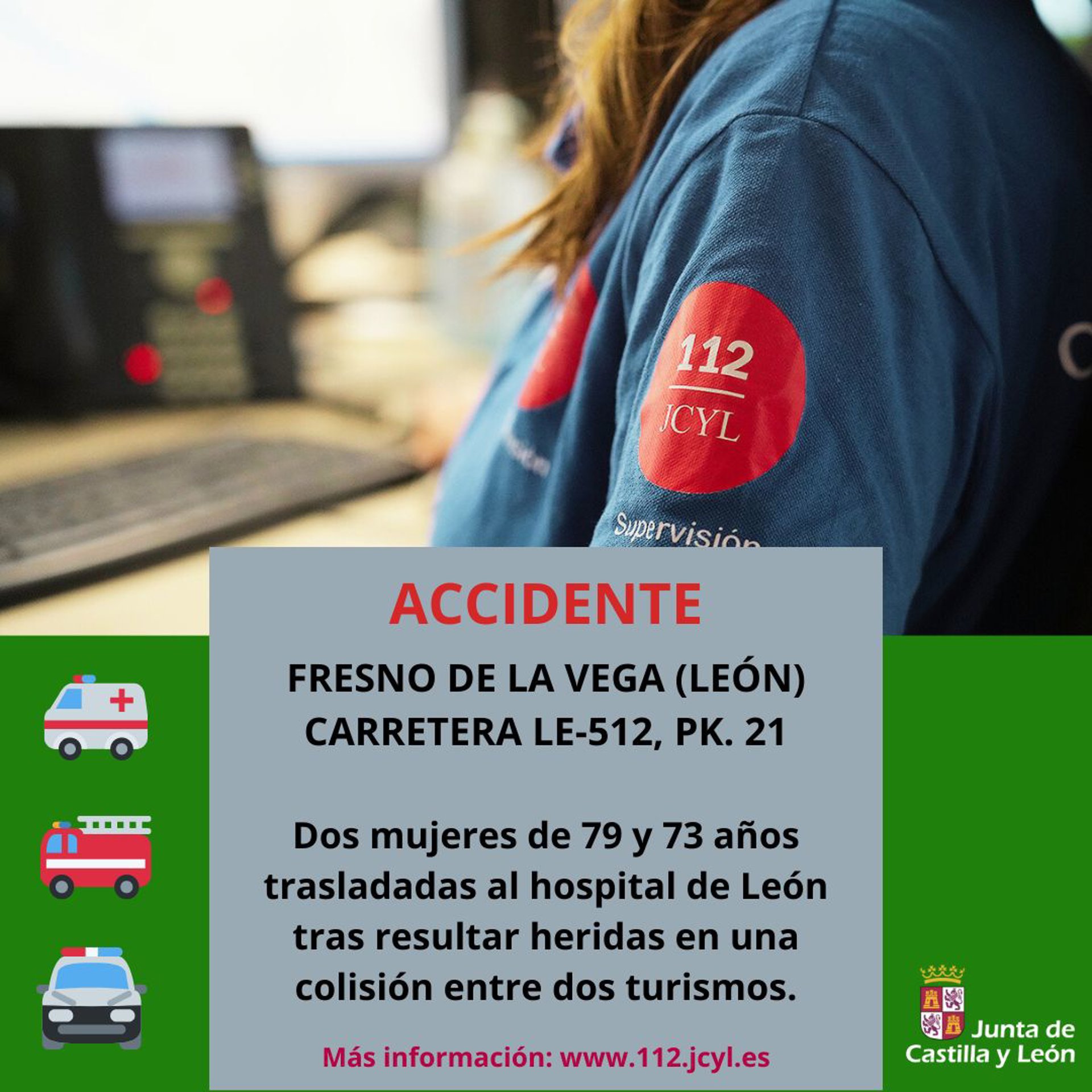 Dos mujeres de 73 y 79 años han resultado heridas en una colisión entre dos turismos, uno de los cuales además ha volcado, en el kilómetro 21 de la carretera LE-512, en la localidad leonesa de Fresno de la Vega, según datos del 112 Castilla y León recogidos por Europa Press.
